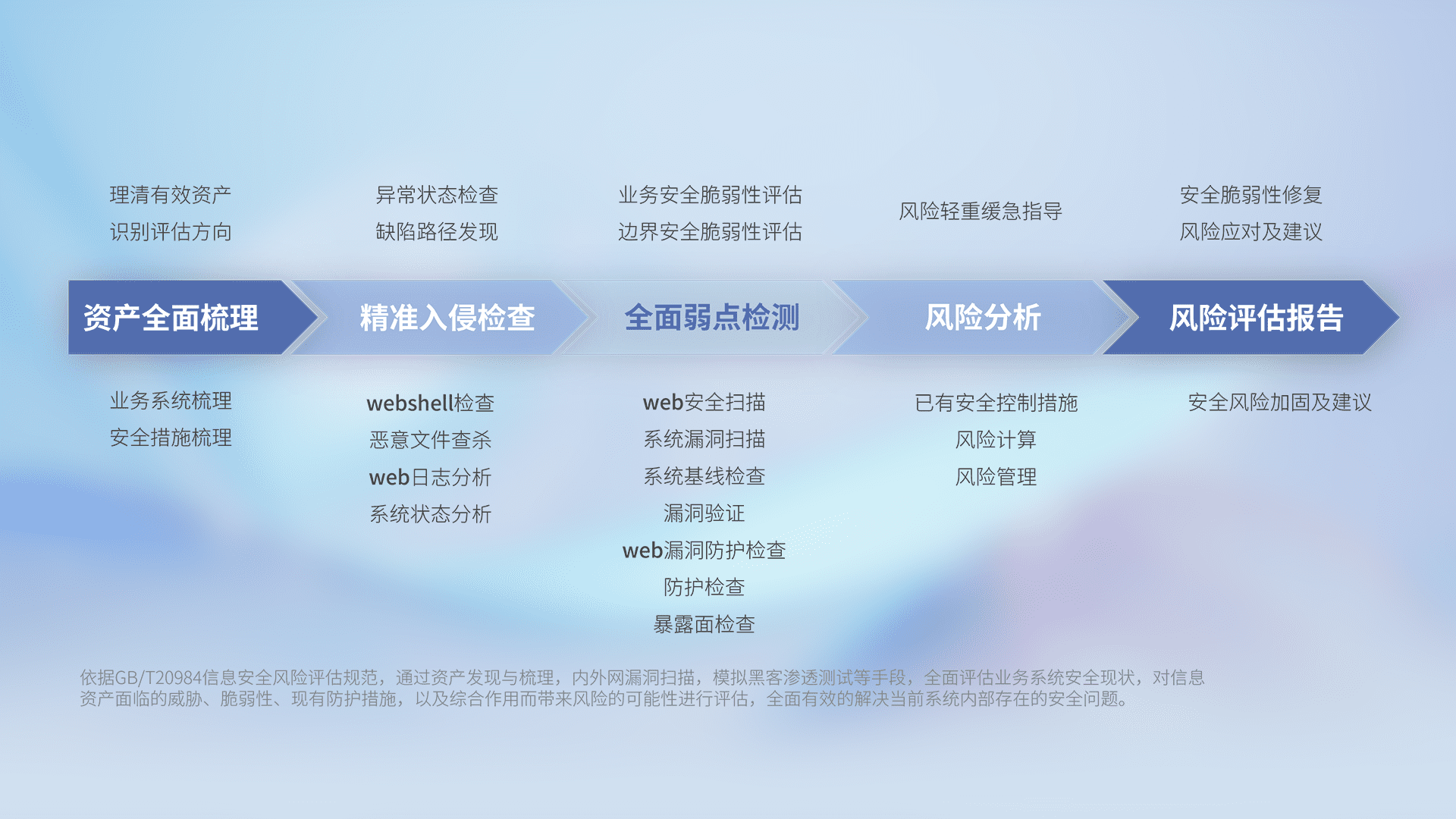 针对客户行业特性,,以专业的安全服务+多厂商联合解决方案提供专属的一站式安全管理服务,,帮助客户全面感知网络空间威胁,,,,基于识别、、、、检测、、、、分析、、、、防护、、、、监测、、、响应的服务理论模型,,,从方案咨询、、、集成交付、、评估验证、、、优化加固、、运维运营,,,致力于为客户提供完整的闭环管理式安全服务。。。以实战经验为客户打造高抵御风险的安全体系,,帮助客户发现威胁、、、、对抗威胁、、、处置威胁,,,,不断积累安全对抗能力,,,持续保障数字化安全。。。